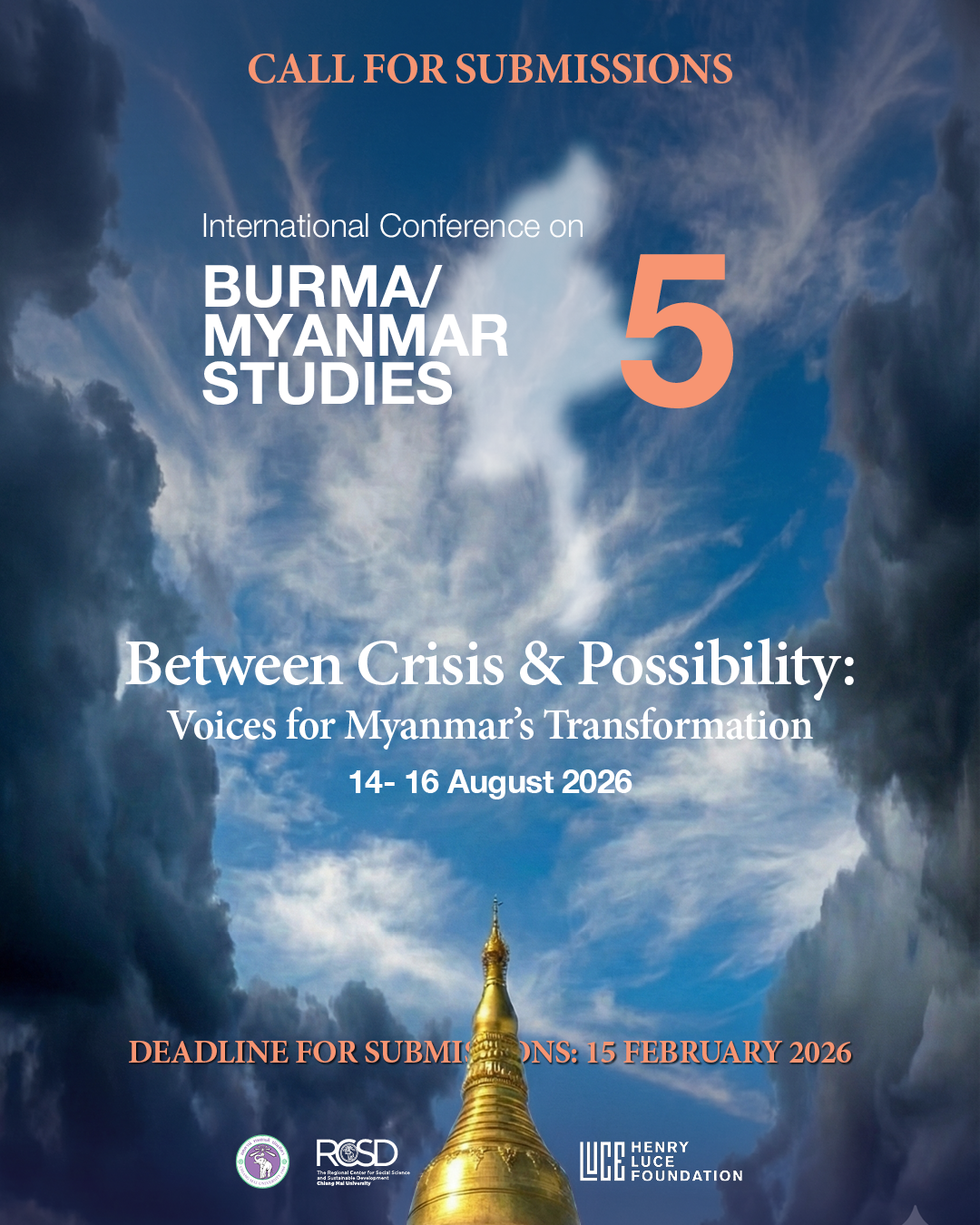The Fifth International Conference on Burma/Myanmar Studies officially calls for submissions to the conference, to be held 14-16 August 2026 in Chiang Mai, Thailand. Individual abstracts, panel proposals, and roundtable proposal submissions are welcome. The deadline for abstracts, panel, and roundtable proposals is 15 February 2026.